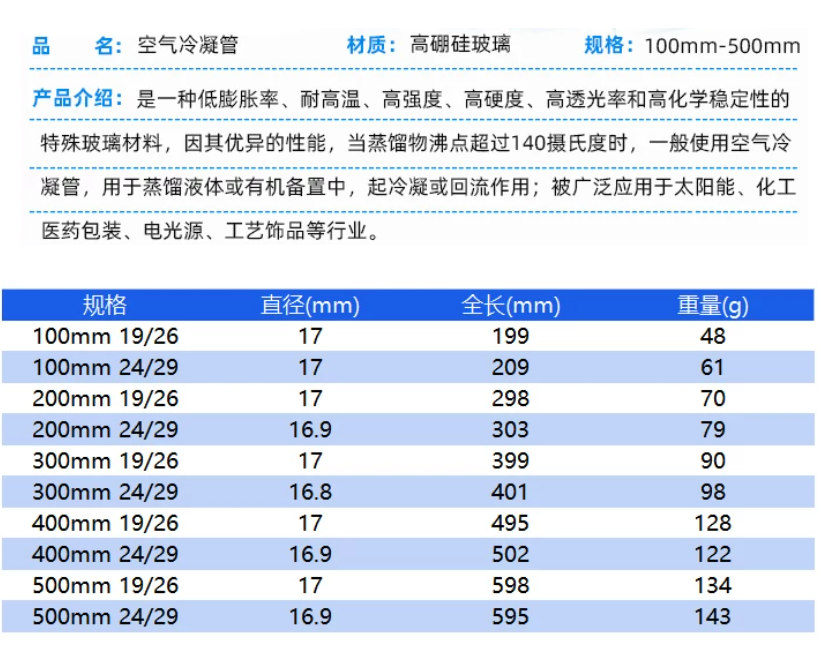 玻璃空气冷凝管200/300/400/500/600mm/19#/24#蒸馏回流冷凝管