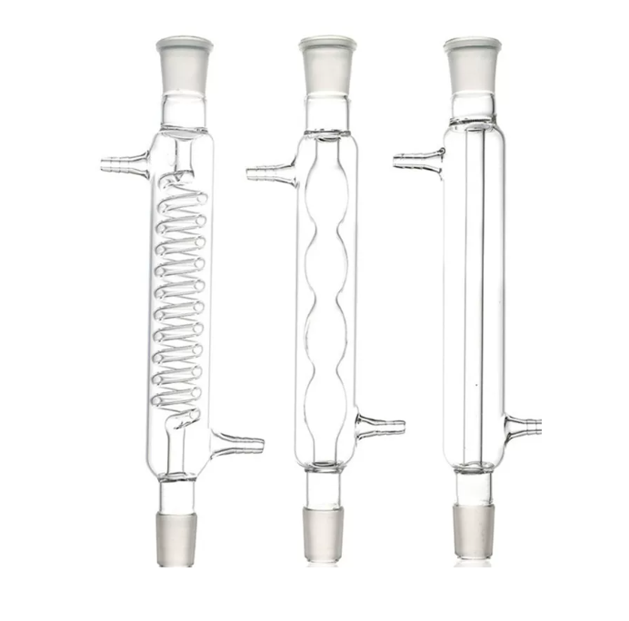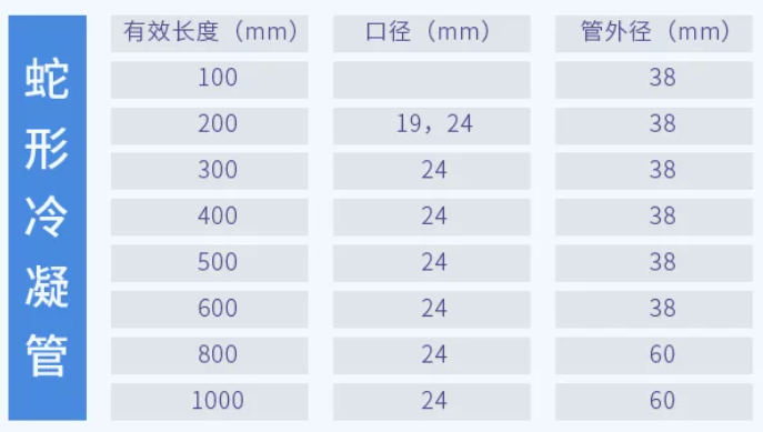 蛇形冷凝管的内芯管为螺旋形,增加了玻璃管的长度,冷却面较球泡形更大。其它部分与球形相同。同样由于内芯管为蛇形,蒸馏时积留的蒸馏液更多,故适用于做垂直式的连续长时间的蒸馏或回流装置。